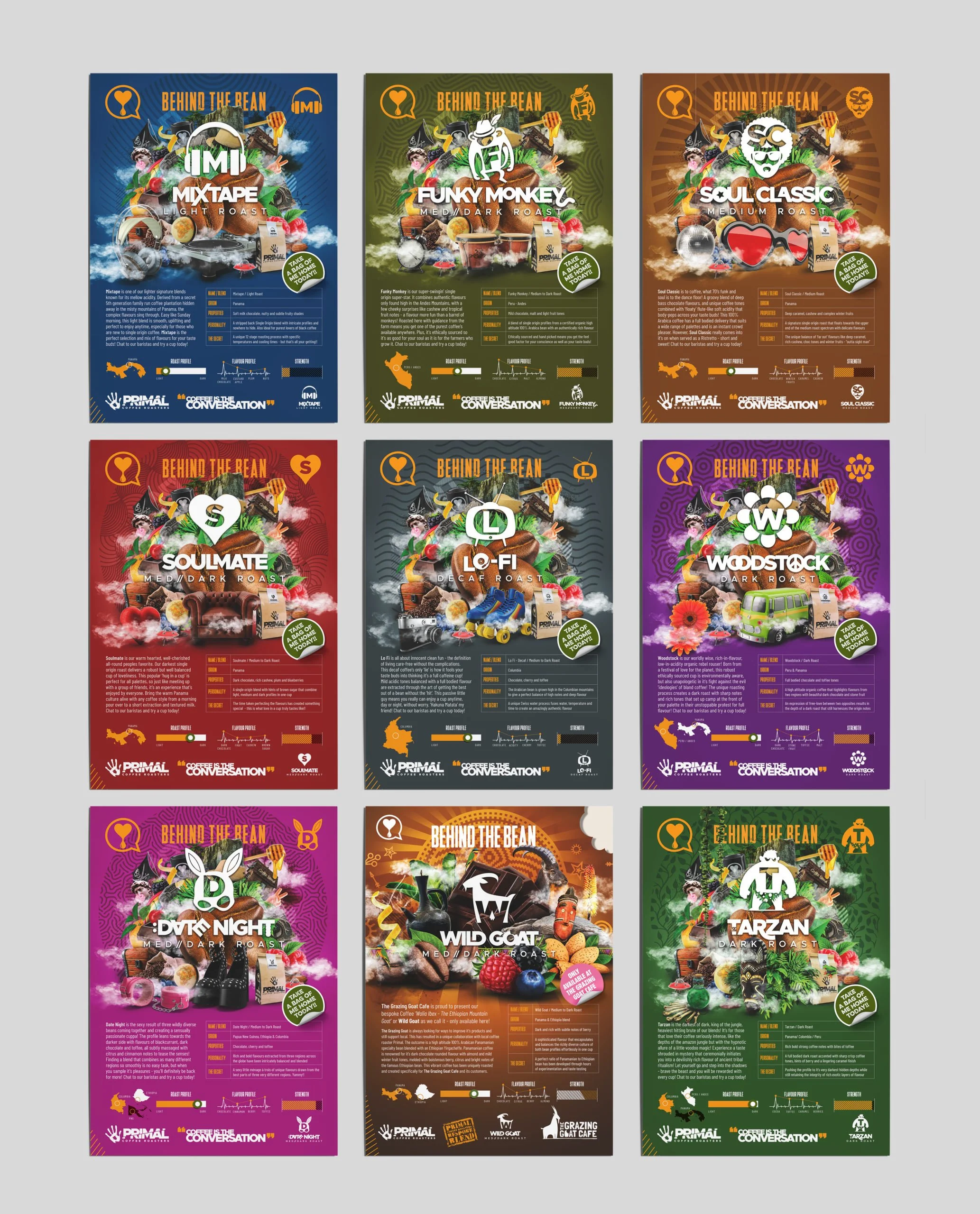 The redhotblue team thoughtfully layered design elements to visually narrate the story behind each coffee blend, making every product feel distinct and cohesive. The vibrant imagery captures attention and radiates energy, reflecting the owner's excitement and passion for coffee. At the suggestion of our Creative Director, the logo was crafted from a direct print of the owner’s hand, a nod to his hands-on involvement in the business and a way to further personalise the brand. The angled split through the typography represents the balance between creativity and science that defines Primal Coffee’s approach. While the subtle inclusion of the owner’s children’s initials as part of the graphic elements pays homage to the family values that form the brand’s foundation.