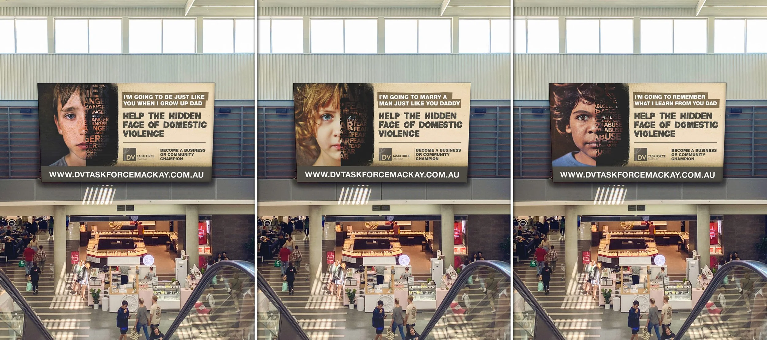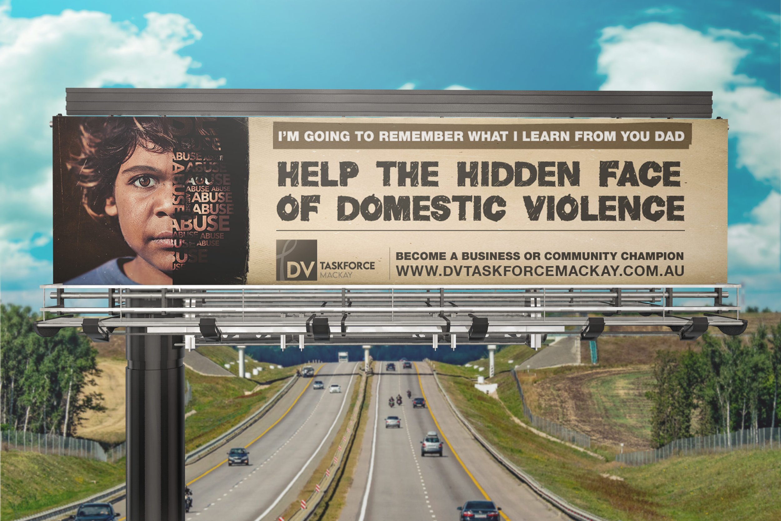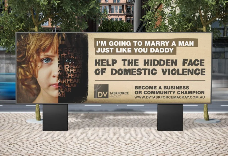 The Hidden Faces of Domestic Violence campaign for DV Taskforce Mackay shed light on the impact of domestic violence on children. Innocent portraits of children were contrasted with gritty textures, symbolising damage that can remain hidden until later in life. From concept development and messaging to billboards, video, and advertising, these campaigns showcased the power of creative communication to drive awareness influence real change.