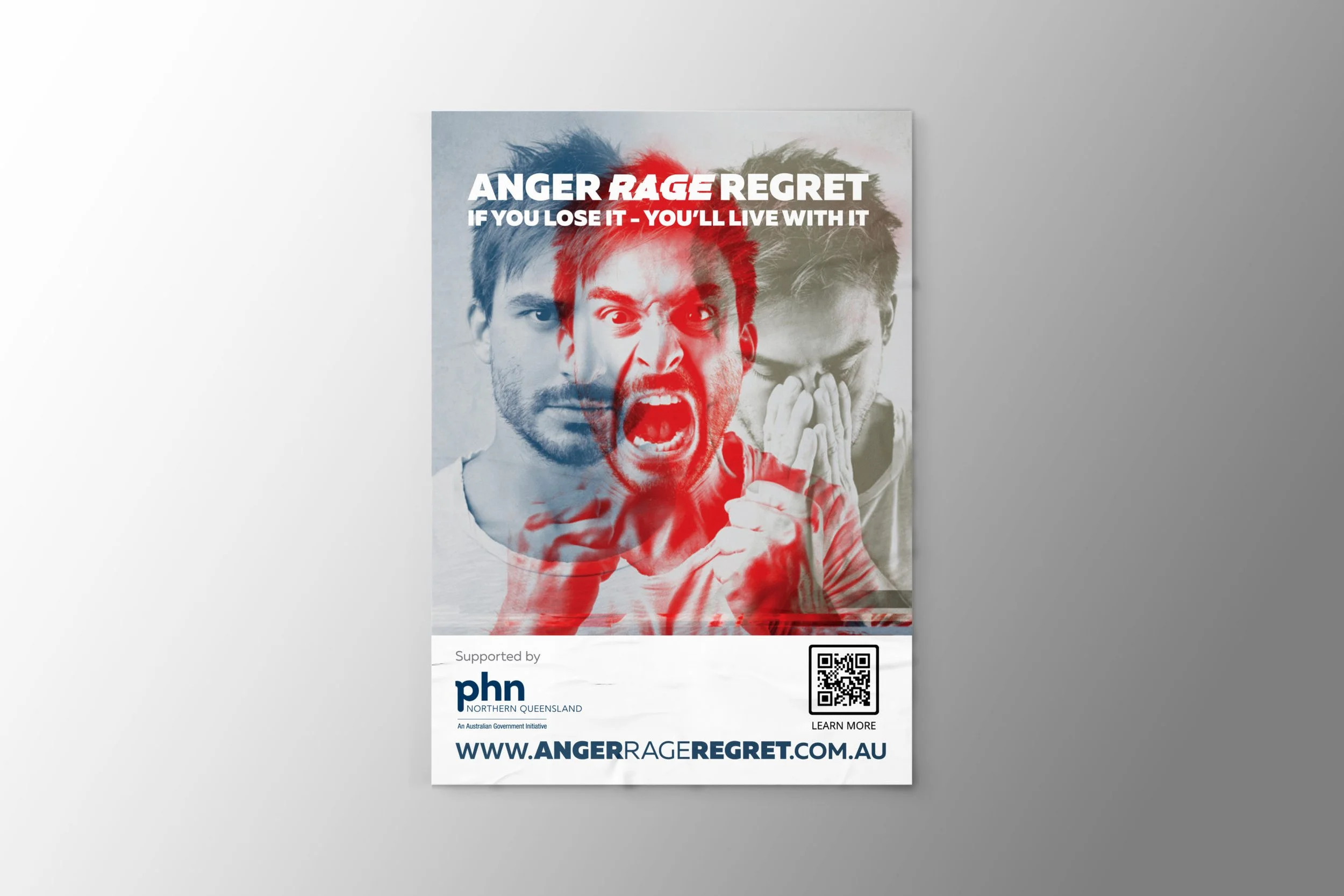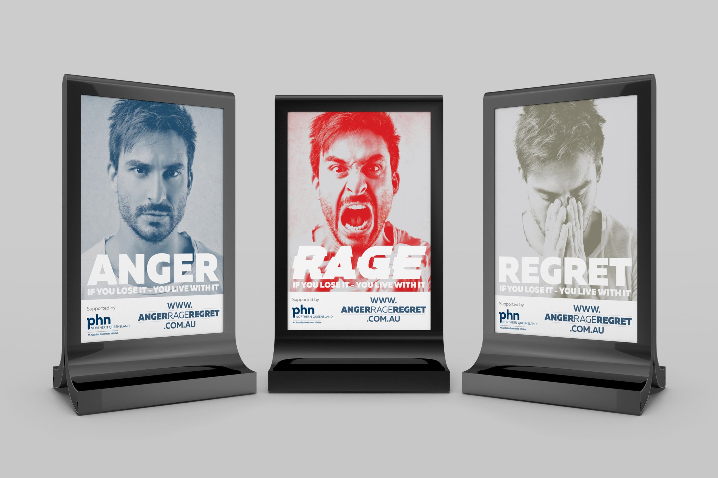 The Anger Rage Regret campaign for PHN Northern Queensland targeted young males, drawing attention to the emotional impulse and lasting consequences of assaults outside licensed venues. We removed the context because anger can occur anywhere and we wanted the focus to be on the feeling, not the trigger. The image shows the emotional transition between anger, rage, regret – often referred to as the red mist - which can occur in a matter of seconds.