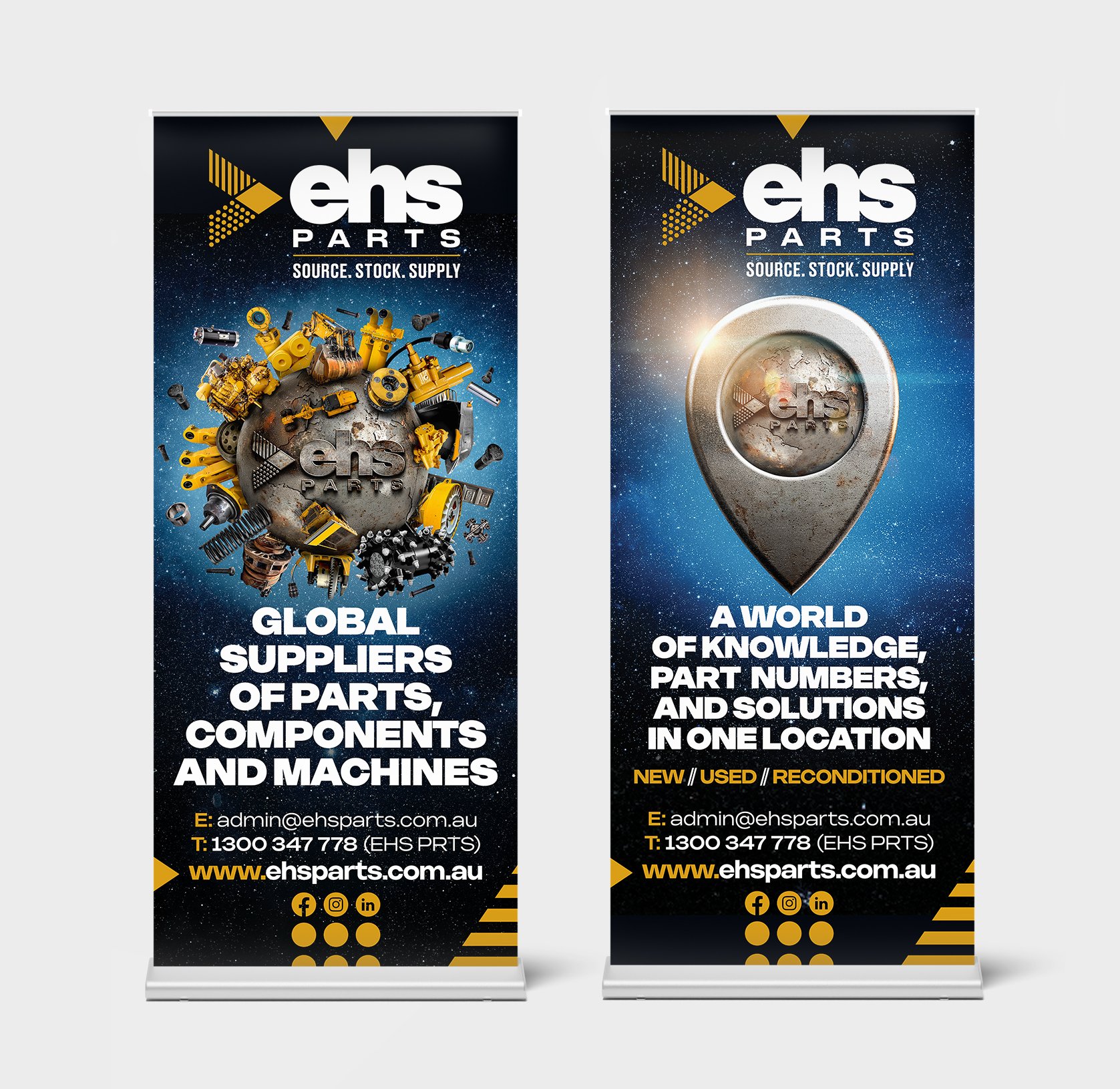 Instead of focusing on what EHS does, we shifted the message to how they help, positioning EHS as the clear answer to their audience’s needs. The globe became the hero of the rebrand, symbolising both their diverse product range and worldwide reach, while the arrow brand-mark reflected the three core layers of machines, parts, and components. A montage-style creative approach condensed multiple messages into one powerful hero graphic, supported by the location marker and the tagline source, stock, supply. Together, these elements established EHS as a strong, unified brand with a global presence.