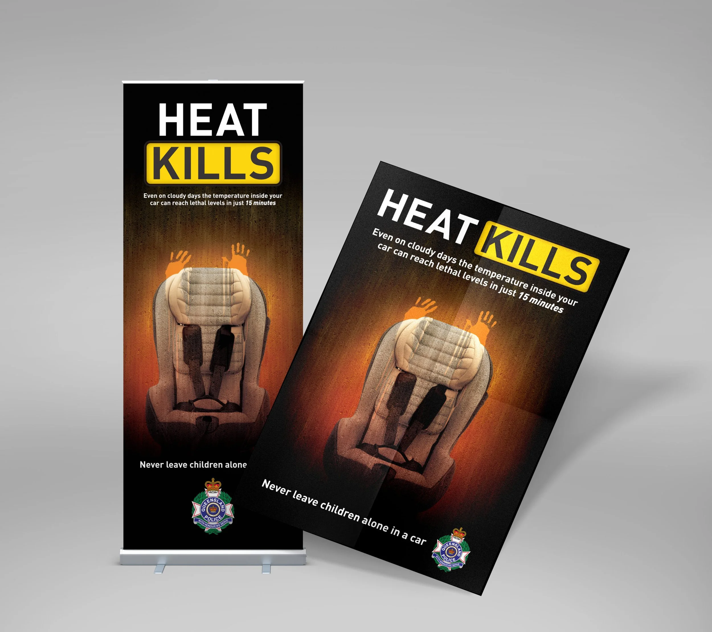 The Heat Kills campaign for Queensland Police used powerful, confronting imagery to highlight the dangers of leaving children in hot cars, earning gold at the QLD Multimedia Awards. Real photography, an empty booster seat, and a child’s handprint on the glass created a haunting scene where someone might imagine their own child in that position. The aim was to grab attention and create awareness without assigning blame.