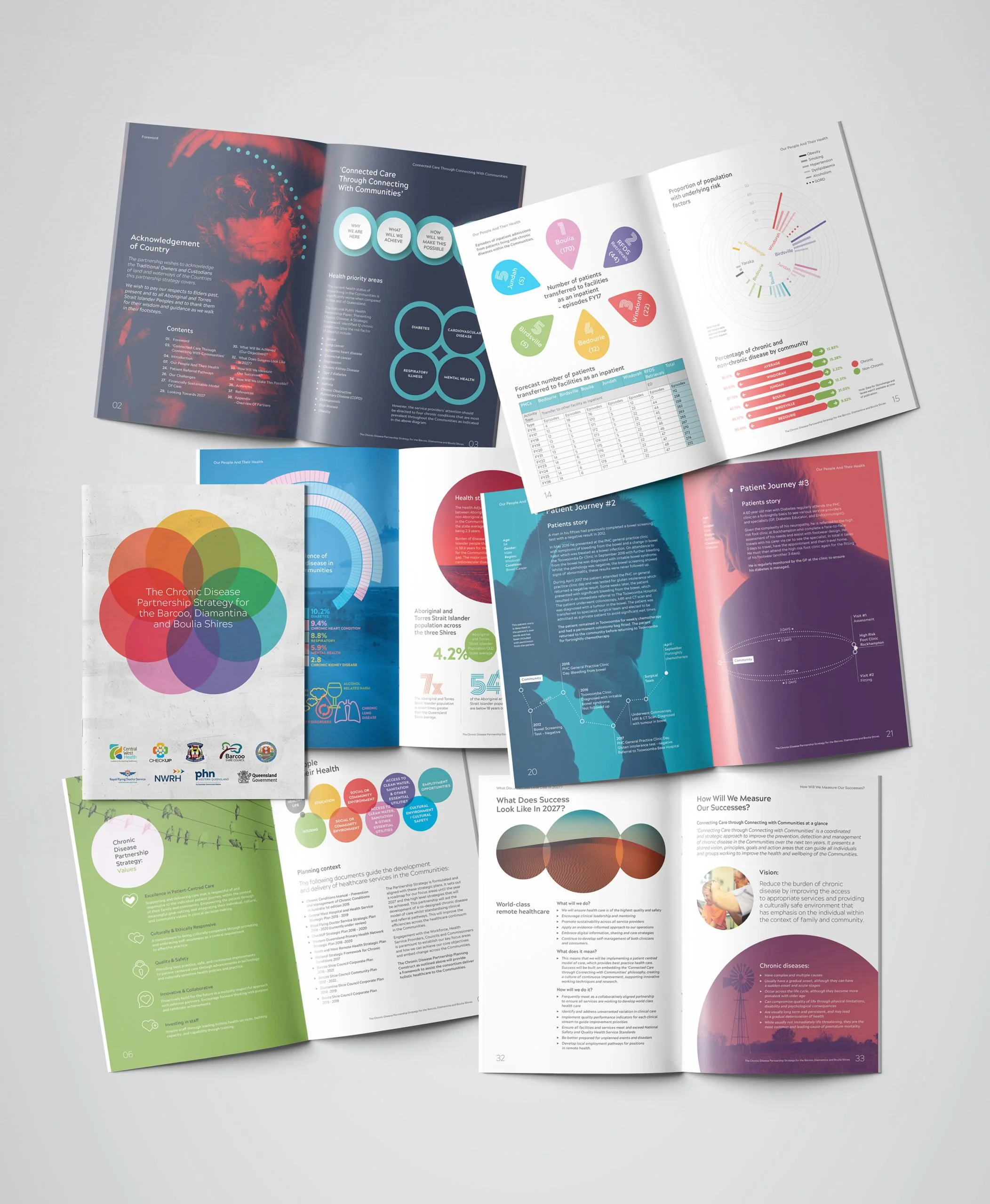 Redhotblue’s ability to consistently interpret the vision of the Board of Directors has been central to our ongoing relationship with Central West Hospital & Health Service. One notable example of our work for this organisation is the Partnership Strategy brochure, where we distilled pages of complex data into clear, one-page infographics, transforming heavy text and statistics into engaging, reader-friendly content. This approach reassured locals by making important information more accessible, a success reflected in direct feedback from the community. Diversity is also embedded in the creative, both in the people showcased and the design elements themselves. In the First Nation’s Health Equity campaign, graphic motifs and colour palettes were inspired by original artwork created by a local Indigenous artist. Through consultation with community elders, we received permission to integrate the artwork, which became a collaborative success, with all parties proud of the outcome.